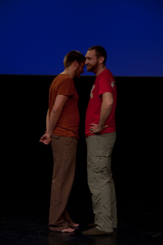 Johannes Birringer [left] and Marios Chatziprokopiou [right] -- Jochem Naafs performing his 'Projecting' piece on the stage